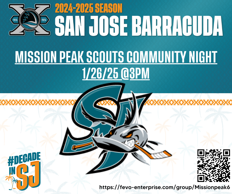 Back by popular demand, Mission Peak District will be hosting its annual Mission Peak Scout Hockey Night! Come out to this awesome game for $20 dollars a person for a fun afternoon game at 3pm. Tons of fun and action for the scouts! For more information and the link to purchase the tickets, click on https://fevo-enterprise.com/group/Missionpeak6