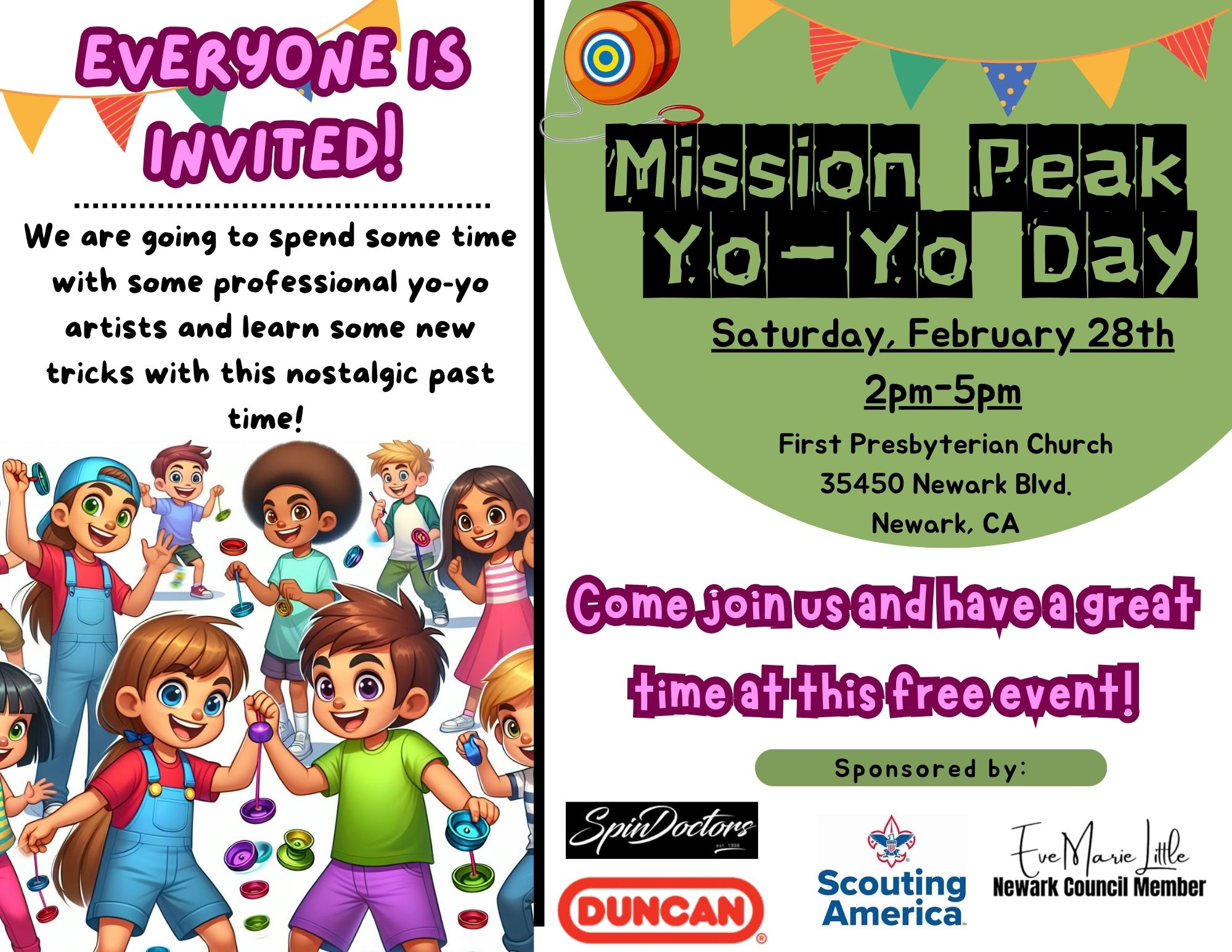Join us for this FREE unique and fun event with a new modern twist! Co-sponsored by Duncan Yo-Yos, San Francisco Spindox Yo-Yo Club, and Scout Leader Eve Marie Little, the Mission Peak District Yo-Yo Day is open to ANY YOUTH who is interested in having fun, especially Cub Scouts working on their Adventure Yo-Yo elective!