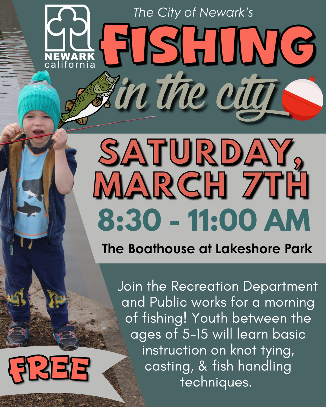If so, come join the city of Newark at the Annual Fishing in the City event on Saturday, March 7th from 8:30am to 11am at the Boathouse at Lakeshore Park. There have been over 5000 pounds of fish put into the lake and we want you to join the Recreation Department and Public Works for a free morning of fishing and hands-on learning. Youth ages 5–15 will rotate through skill stations and learn the basics of: