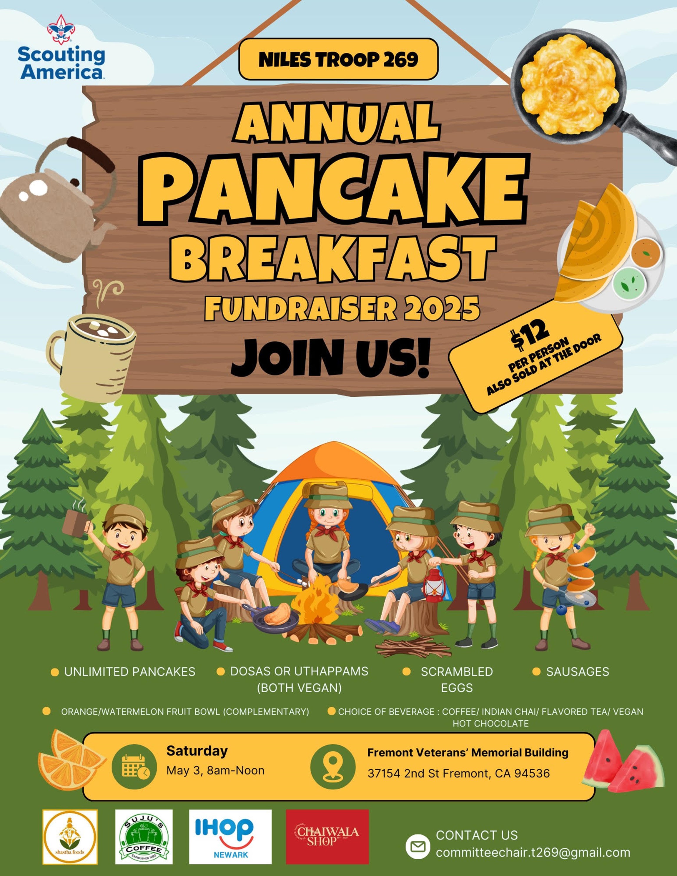 Come out and enjoy a great breakfast for you and your family while supporting Troop 269! On Saturday, May 3rd, the largest fundraiser for Troop 269 will be happening at the Fremont Veteran’s Memorial Building in the Niles area from 8am to 12noon. Bottomless Pancakes! Dosas/Uthappams! Scrambled Eggs! Sausages and more!