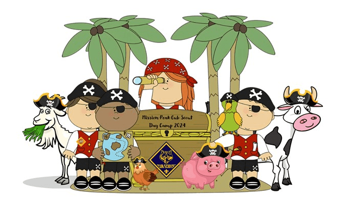 Hear Ye! Hear Ye! We are excited to share with you that our Mission Peak Cub Scout Day Camp’s theme this year is “Pirates and those under the Sea” at Ardenwood Farm this year from June 10-14, 2024. We are working on finalizing the details but we will let you know when the registration officially opens. But as of now, get your Pirate boots ready, dust the powder off your ship, and let your fishie little friends know about this yearly fun time!