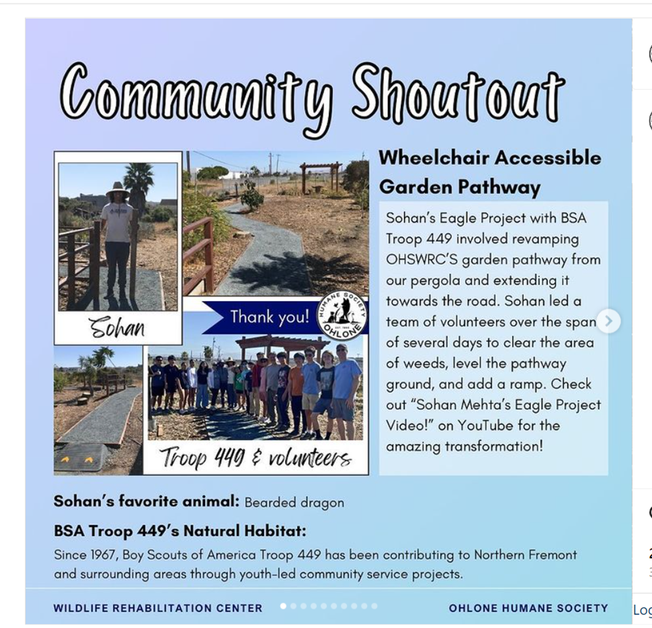 Great job Sohan and Troop 449! Click on the following link to learn more! Wildlife Rehabilitation Center β Ohlone Humane Society