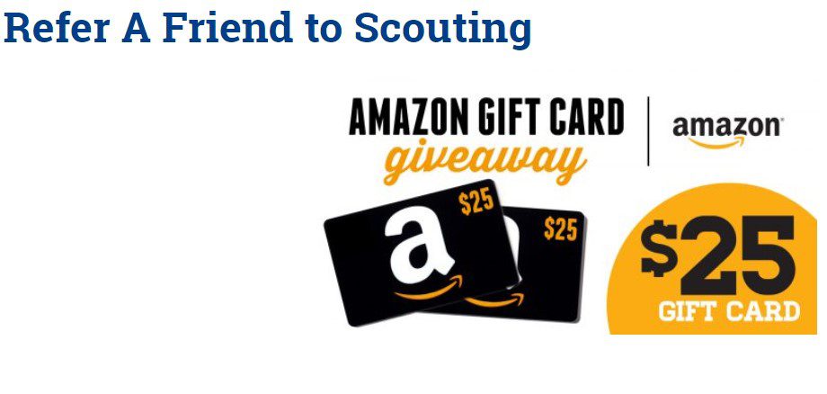 We are excited to announce a new Refer A Friend Incentive for all Mission Peak District Scout Families. We will be offering a $25 Amazon gift card each month this year.  Any Mission Peak District family is eligible to win each month.